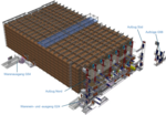 The high-bay warehouse is directly connected to the conveyor system on three levels. Roller conveyors and belt conveyors transport Euro and industrial pallets as well as plastic tubs across several floors. Four pallet lifts provide vertical transport. The system control, including visualization, and an SAP connection via reporting points for the material flow computer and the warehouse management system at the SAP level ensure the smooth flow of the conveyed goods.