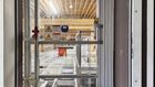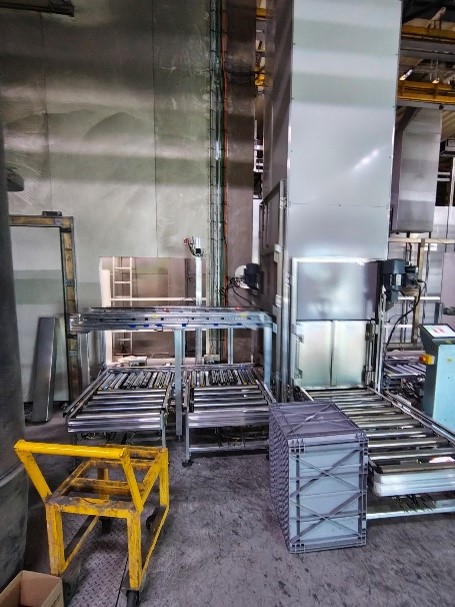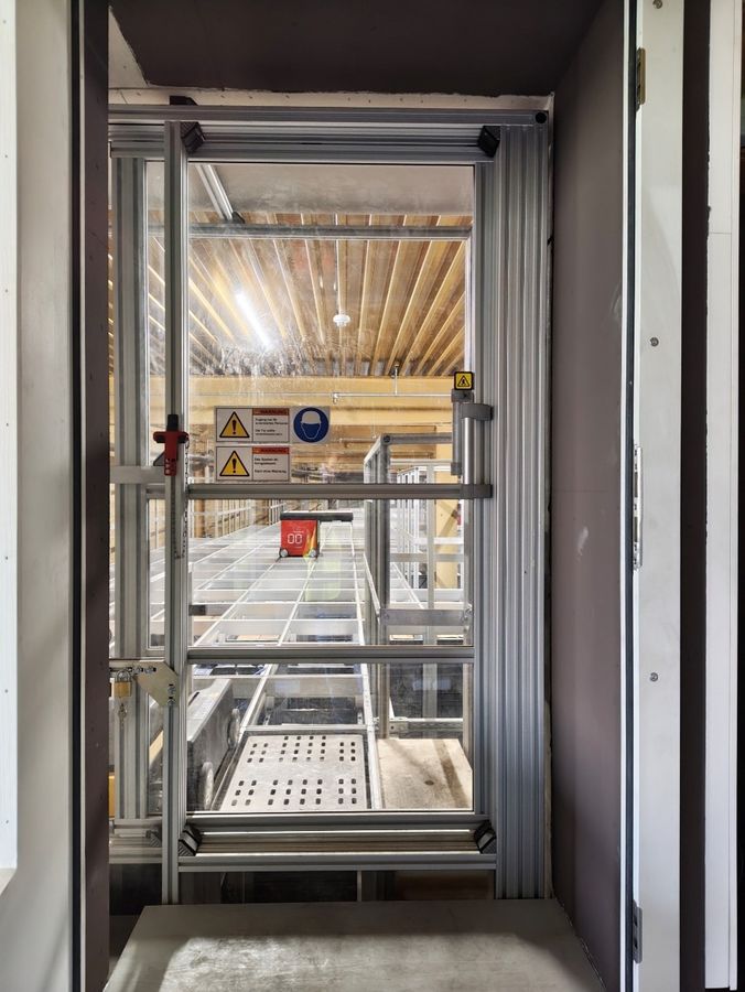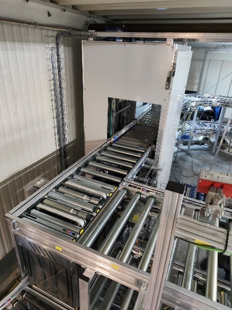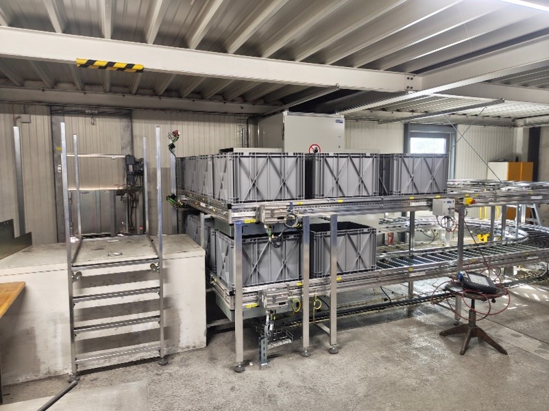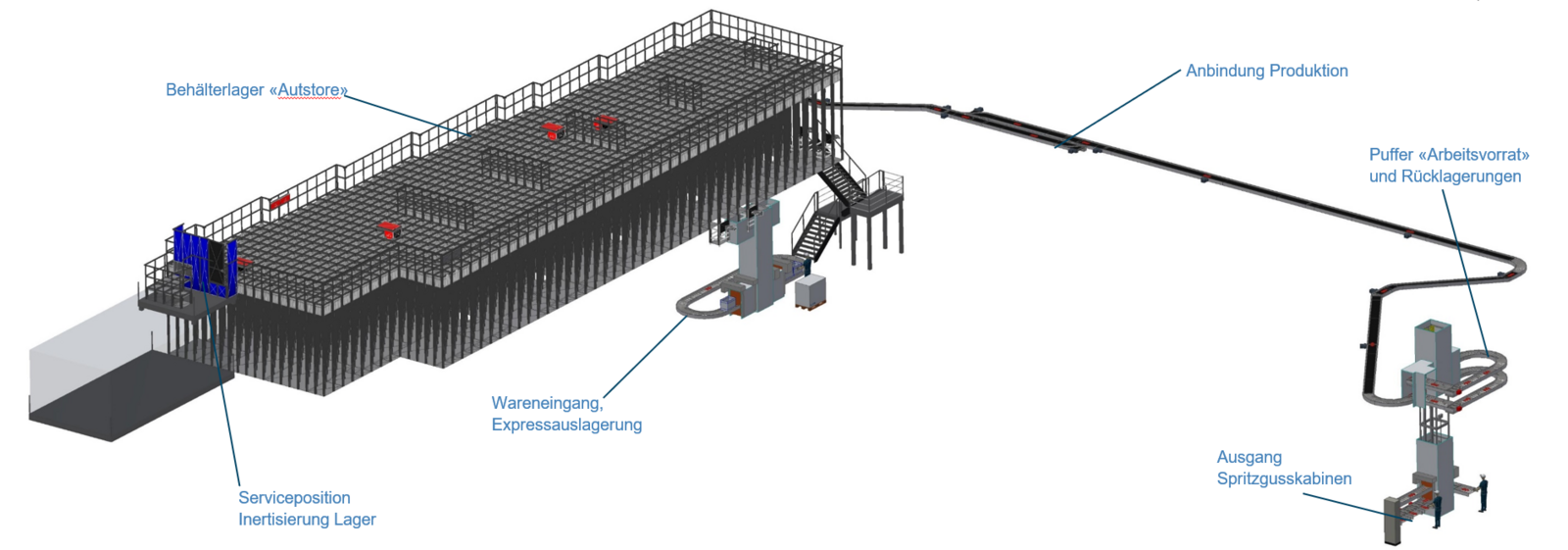 Die Verbindung in die Produktion verläuft über das Dach im Aussenbereich und dient die erforderlichen Behälter direkt in der Produktion an. Rücklagerungen erfolgen über dieselbe Strecke. Für Wareneingänge und Express-Auslagerungen ist ein Heber direkt ans Lager angebunden.